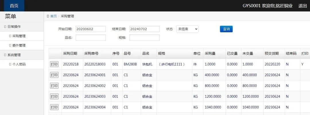 3、打开采购管理界面,显示未交采购信息,如需要交货可以同步打印二维码标签等,后续将会加入根据未交采购单生成未审核的进货单