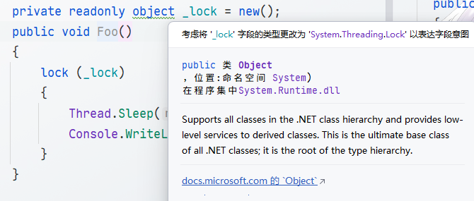 ℹ️ 在使用.net9创建项目时,如果使用object类型的锁,rider编辑器会提示使用Lock类型作为锁。
