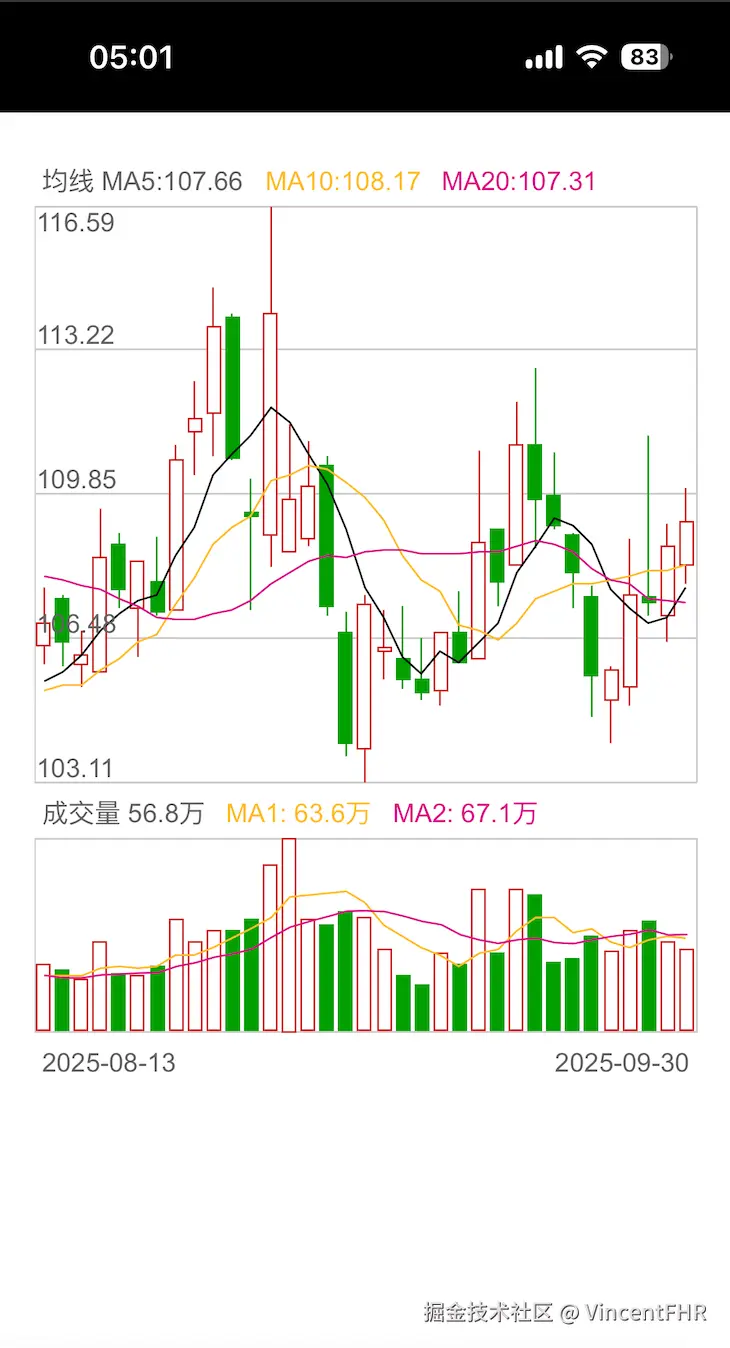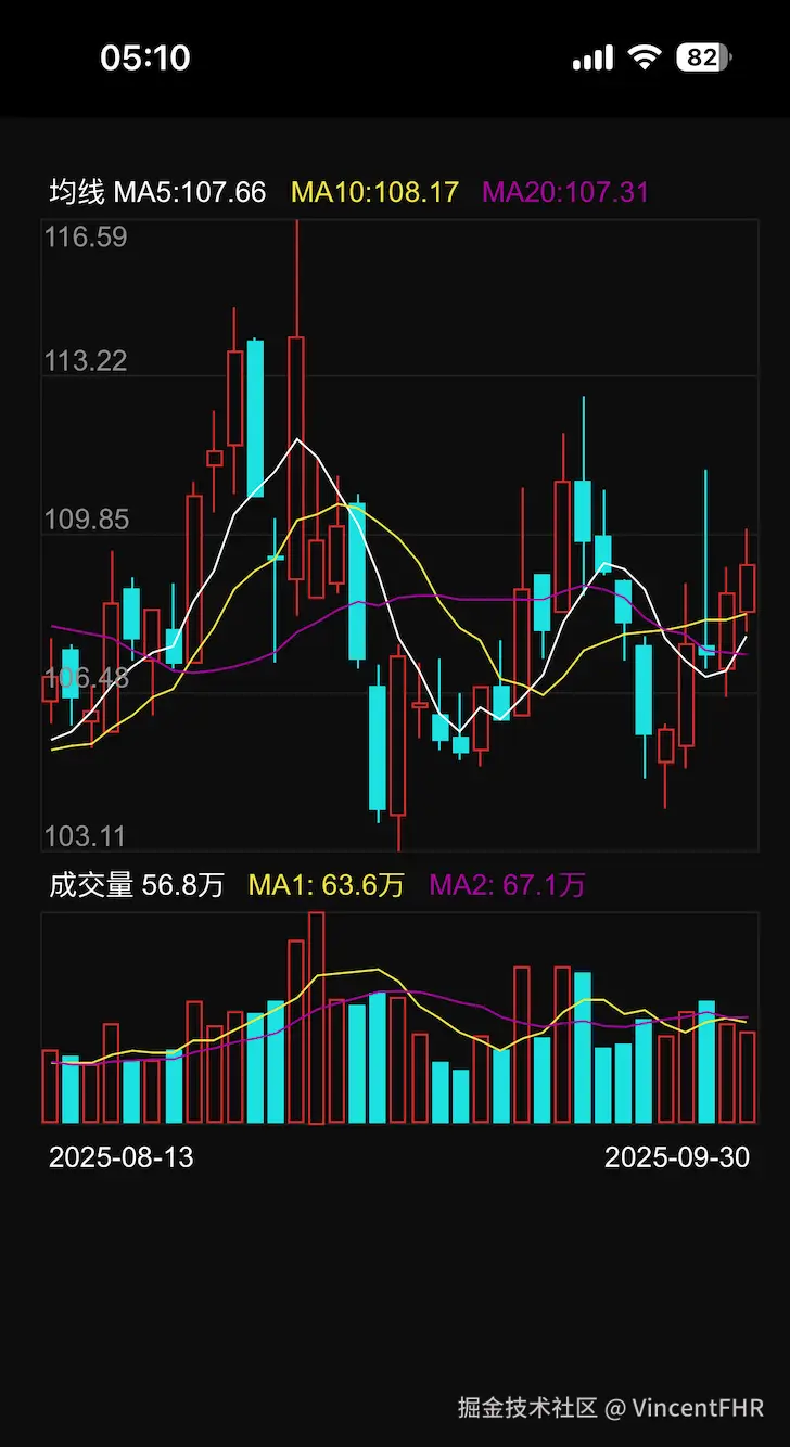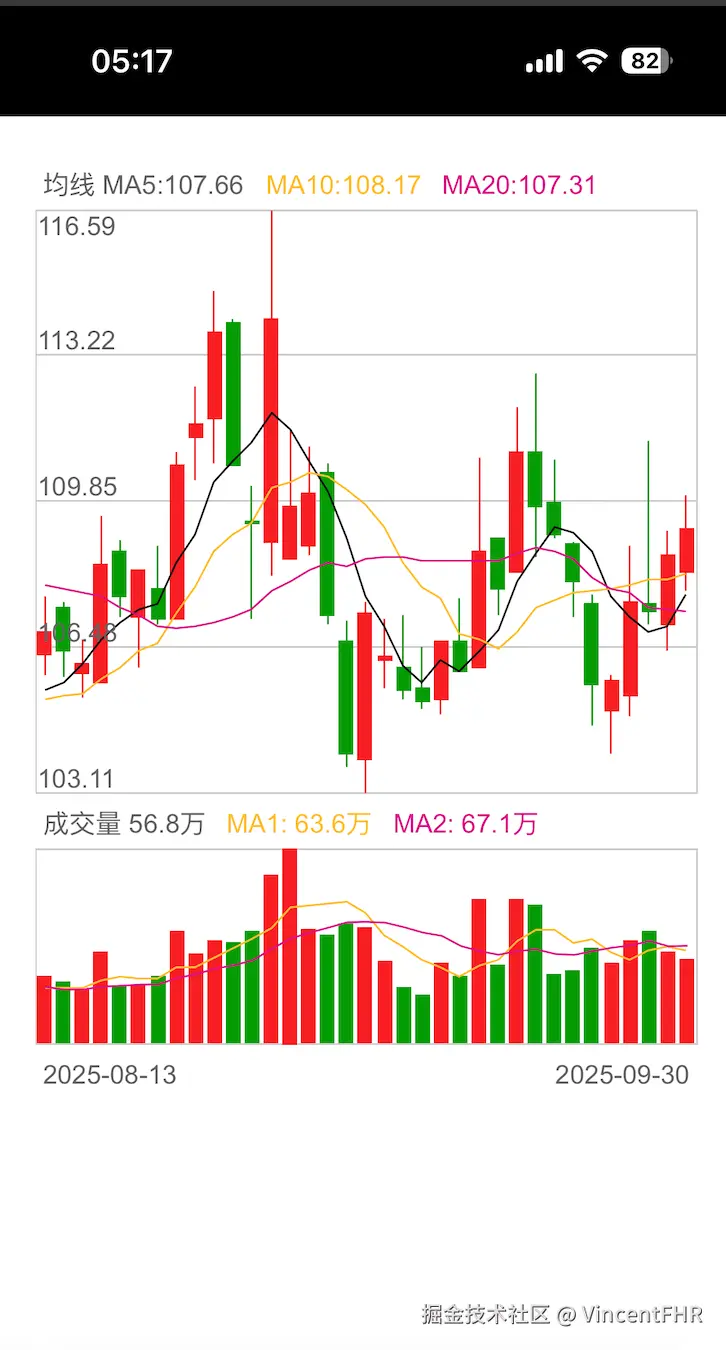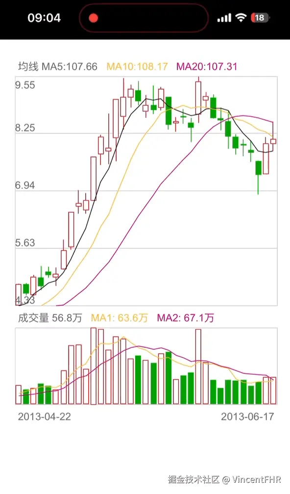 前言证券行业,最难的前端组件,也就是k线图了。 1、H5 K线图,支持无限左右滑动、样式可随意定制; 注意:以上的 demo 还有一些 bug, 没时间修复, 预览地址是直接在 github 上部署的, 所以最好通过 vpn科学上网,否则可能访问不了,然后再在移动端打开页面。 另外, 上面的股票详情页, 还没有做自适应,等我有时间再改。 一、先看最终的效果1、GIF动图如下