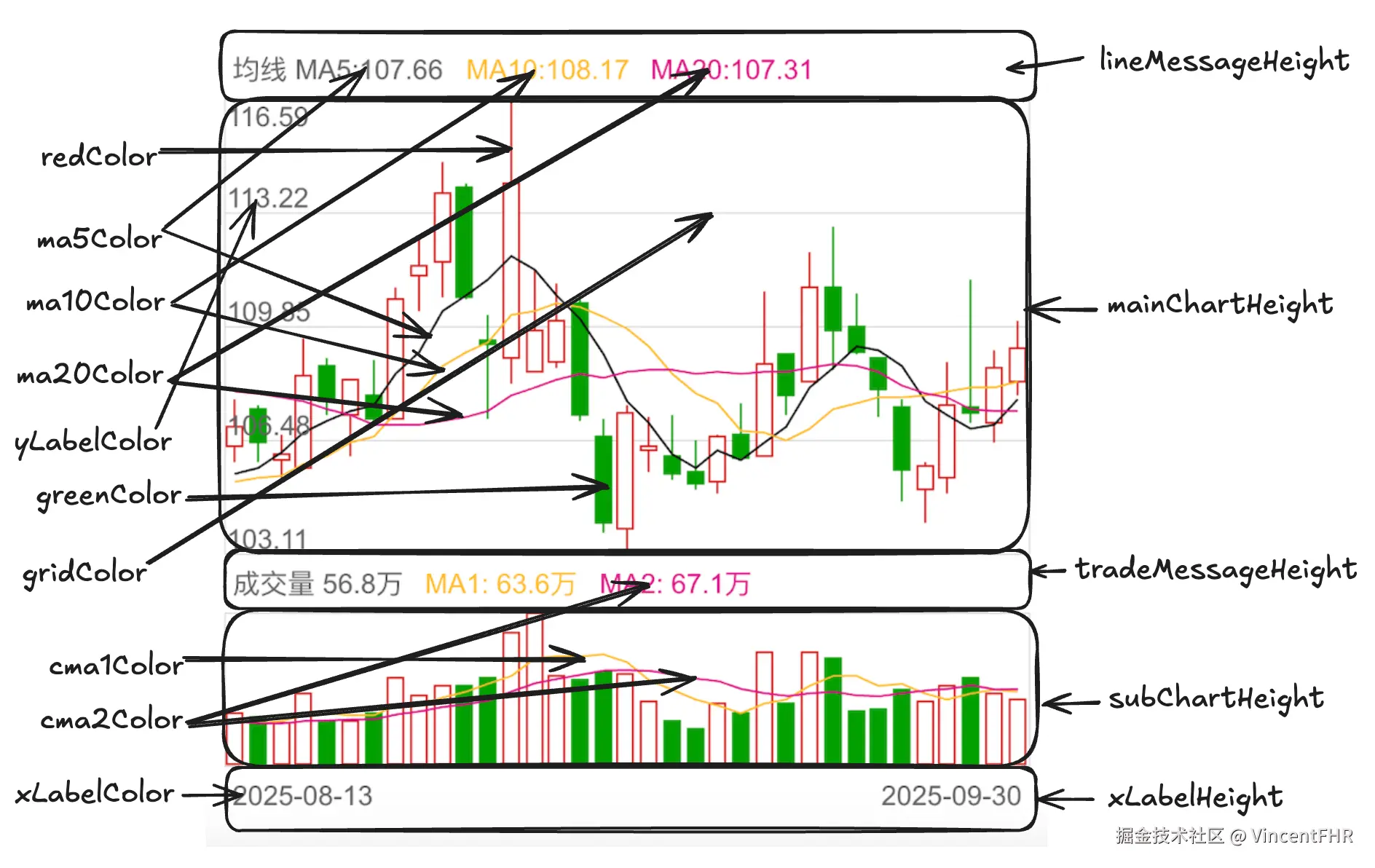二、canvas 注意事项1、整数坐标,会导致模糊canvas 在画线段, 通常会出现以下代码: 假设上面的两个点是(1,10)和(5,10),那么画出来的实际上是一条横线, 但是 canvas 不是这样处理的, canvas 默认线条会与整数对齐, 并且由于粗度被拉伸,颜色也会被淡化,那怎么解决这个问题呢? 处理方式也很简单, 通过 cxt.translate(0.5, 0.5) 将坐标往下移动 0.5 个像素, 典型的代码如下: 在我的代码中, 也体现了类似的处理。 2、如何处理高像素比带来的模糊设备像素比越高,理论上应该越清晰,因为原来用一个小方块来渲染1px, 现在用2个(dpr=2的情况)小方块来渲染,应该更清晰才对,但是canvas不是这样的。 例如,通过js获取父容器 div 的宽度是 width, 这时候如果设置 canvas.width = width,在设备像素比为2的时候, canvas 画出来的宽度为css对应宽度的一半, 如果强制通过 css 将 canvas 宽度设置为 width, 则 canvas 会被拉长一倍, 导致出现锯齿模糊。 注意了吗?上面所说的 canvas.width=width 与 css 设置的 #canvas { width: width } 起到的效果是不一样的。不要随便通过 css 去设置 canvas 的宽高, 容易被拉伸变形或者导致模糊。 通用的处理方式是: 三、样式配置为了方便样式自定义, 我独立出一个默认的配置对象 defaultKlineConfig, 参数的含义如下图所示,其实下图这个风格的标注, 是通过 excalidraw 这个软件画的, 也是 canvas 做的开源软件, 可见 canvas 在前端可视化领域的重要性, 这个扯远了,打住。