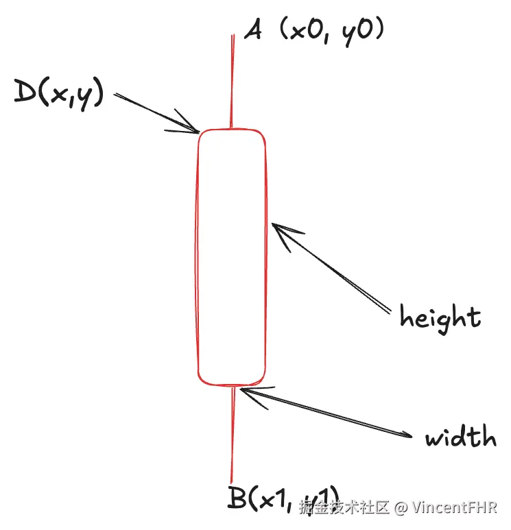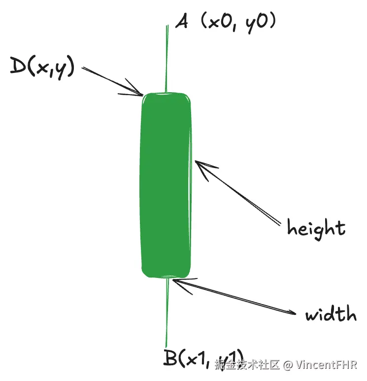 当收盘价大于等于开盘价, 选用上面左边红色的样式; 当收盘价小于开盘价, 选用上面右边绿色的样式。 以红色蜡烛为例, 最高点 A(x0, y0),最低点是 B(x1, y1), 为了画出红色蜡烛, 先后顺序别搞混: