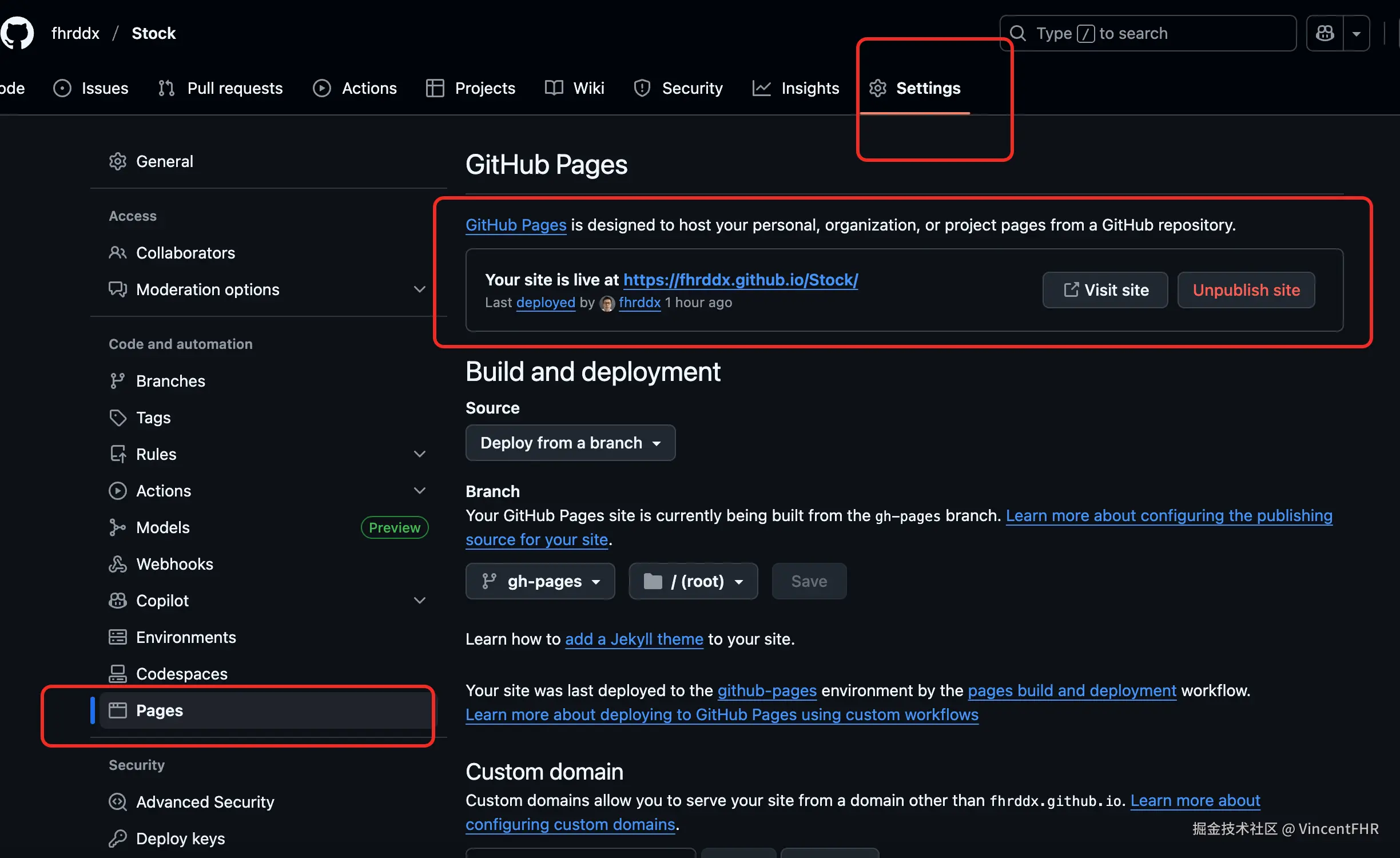 2、离屏渲染当需要在K线上标注一些icon时, 这些 icon 可以先离屏渲染, 需要的时候, 再copy到变动层对应的位置,这样比临时抱佛脚去画,要省很多时间,也能提高新能。 3、设置数据缓冲区就是屏幕只渲染一屏数据, 但是在当前屏的左右两边,各缓存了2屏数据, 超过5屏数据的时候,及时裁掉多余的数据, 这样arraylist的数据量始终保持在5屏, 控制了数据量,有效的控制了占用空间。 4、节流防抖touchmove 会很频繁触发, 可通过节流来控制,减少不必要的渲染。 十、部署到GitHub Pages1、安装gh-pages包2、package.json 添加如下配置注意, Stock 这个需要对应github的仓库名 3、运行部署命令
