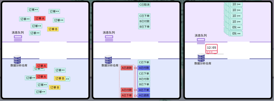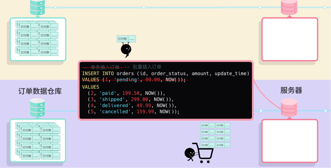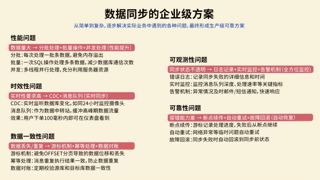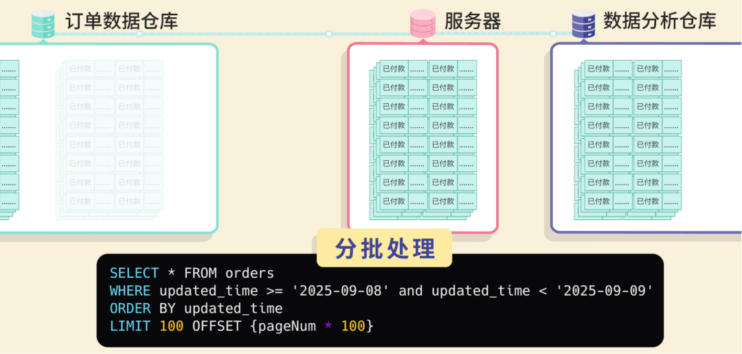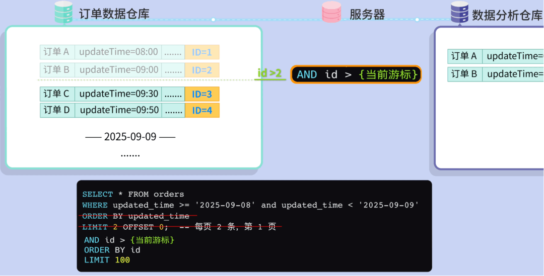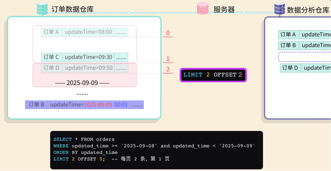 全量同步什么是数据同步呢?就像你有两个手机,要把其中一个手机的照片复制到另一个手机里。数据同步就是把一个数据库的数据,定期复制到另一个数据库里。 你心想:这还不简单吗?我写个定时任务,每天 把整个订单表的数据 全部查出来,然后 一股脑插入 到数据仓库! ![]() 这种方法叫 全量同步,不管数据有没有变化,每次都把所有数据重新复制一遍,简单粗暴。 第一天,公司有 1 万条订单数据。你的程序跑了 3 个小时,同步成功! 老板看着数据夸到:不错啊小阿巴,开发神速啊! ![]() 你内心暗爽:高端的功能往往只需要最简单的代码。 ![]() 基础告警第二天一早,你还没到公司,就收到了运营小姐姐的夺命连环 call:“小阿巴!出大事了!昨天晚上的数据同步失败了,现在老板还没看到昨天的数据,他正在会议室发火呢!” ![]() 你意识到:现在的程序是不可靠的,如果因为网络等原因同步失败了,可能要到第二天才会发现。 于是你给程序加了一段逻辑:如果同步失败,会记录错误日志,同时发邮件通知管理员,并且把数据库回滚到同步前的状态。 ![]() 这样如果出了问题,你会比老板先发现,手动重新执行一遍同步任务就好。 增量同步过了几天,老板黑着脸找你了:“小阿巴,为什么今天数据还没同步完?” 你看了下订单数据,立刻发现了问题。现在有 10 万条数据,程序跑了 30 个小时还没结束;这样下去,如果有 100 万条数据,估计要 300 个小时! 老板:少废话,快点解决,不然送你到隔壁餐饮部沉淀沉淀。 ![]() 你开始思考:既然全量同步太慢,那我只同步每天新增的订单不就行了? ![]() 这就是 增量同步,约定每天 0 点执行同步任务,只同步昨天 0 点之后创建的订单。 ![]() 这样大大减少了每次同步的数据量,任务的执行时间不再线性增加了。 但很快,你发了一个问题,订单的状态是会发生变化的,比如用户付款后又退款。 如果使用订单创建时间作为增量同步的分界标志,只能同步新增的订单,但是订单状态的更新不会同步! ![]() 于是,聪明的你使用 updated_time 字段进行增量同步,这个字段会在每次数据变化时自动更新。 ![]() 这样新增和修改的数据都能同步了! 你内心窃喜:聪明如我小阿巴,老板夸我好开发。 ![]() 批处理过了几天,公司搞了一波大促活动,当天订单量比平时多了几倍,老板请大家通宵狂欢开 party。 结果正在你欢唱 “只因你太美” 的时候,突然公司的运维大叫:不好了不好了,我们的项目服务器卡死了,用户无法下单! 你看了看时间,0 点多,不正是数据同步任务的执行时间么?你瞬间汗流浃背,放下麦克风,赶回公司修 Bug。 原来是因为一次查询出来的订单数据太多了,都加载到内存,导致服务器 OOM 内存溢出了。 ![]() 你悔不当初:唉,早该想到这个问题,既然单次处理数据量太大有风险,那我就 分批处理。 每 100 条数据为一批,每次只从数据库中分页查询出这一批数据,同步完这一批,再执行下一批。 ![]() 这样每次只处理少量数据,内存压力小;而且如果某一批处理失败,只需要回滚和重新同步这一批,而不是全部重来。 问题算是解决了,但是今夜你彻夜难眠,你似乎成了公司业务增长后,唯一不开心的那个人。 ![]() 希望今后不会再遇到这种闹心事了吧。 游标机制但生活总是这样,屋漏偏逢连夜雨。两天后,你又收到了老板的咆哮:“狗阿巴,这就是你做的数据同步?你自己看看丢了多少数据!” 你大惊,丢失数据?不应该啊。。。 经过仔细排查,你发现了问题:如果在分页查询的过程中,有新的数据被插入或更新,就会导致数据偏移和丢失! 比如查询第 1 页时,符合条件的订单有 4 条: 执行第 1 页查询,每页 2 条,偏移量为 0: 查询结果返回订单 A(08:00)和订单 B(09:00),同步完成后将偏移量调整为下一页 可就在查询下一页前,订单 B 因为 “修改订单状态” 被更新,这时订单 B 的更新时间就不在查询范围内了。 这就导致查询下一页 ![]() 怎么解决这个问题呢? 这可难不倒你小阿巴,既然 动态数据集 中使用 SQL 自带的 OFFSET 偏移作为分页起点会出问题,那不妨 自定义一个标志来记录下一批要同步的起点。 这就是游标机制。 比如我约定自增的主键 id 作为游标,每查询一批数据之后,把这批数据的最后一条记录作为新的游标值;查询下一批数据时,只查询 id > 游标的数据。 ![]() 这样不仅防止数据丢失,还避免了 OFFSET 深度分页带来的性能问题。 此外,如果把游标想象成进度条的断点,可以更清晰地记录同步进度,失败后可以从断点继续。 做完这一通优化后,你长吁了一口气,工作看来是保住了。 ![]() 性能优化你以为终于可以安稳一段时间了。但没想到,公司的好日子才刚刚开始。 随着老板大力扩张业务,公司每天的订单量可以达到百万条,你的同步任务每次要跑几个小时才能完成。 更要命的是,老板现在对数据的依赖越来越强,要求每隔 2 个小时就要同步一次数据! 怎么能够让任务执行更快呢? 这时,你想起了曾经在 程序员面试神器 - 面试鸭 上背过的各种性能优化八股文。好家伙,终于能派上用场了! ![]() 首先,修改插入数据库的操作方式。之前是一条一条地插入订单数据,改为执行一条批处理语句来同时插入同一批内多个订单数据,减少了跟数据库通信的次数,性能大幅提升。 ![]() 但是你觉得还不够快,于是优化了批处理的流程。之前是等一批同步完再同步下一批,串行执行;现在你启动了多个线程,每个线程负
