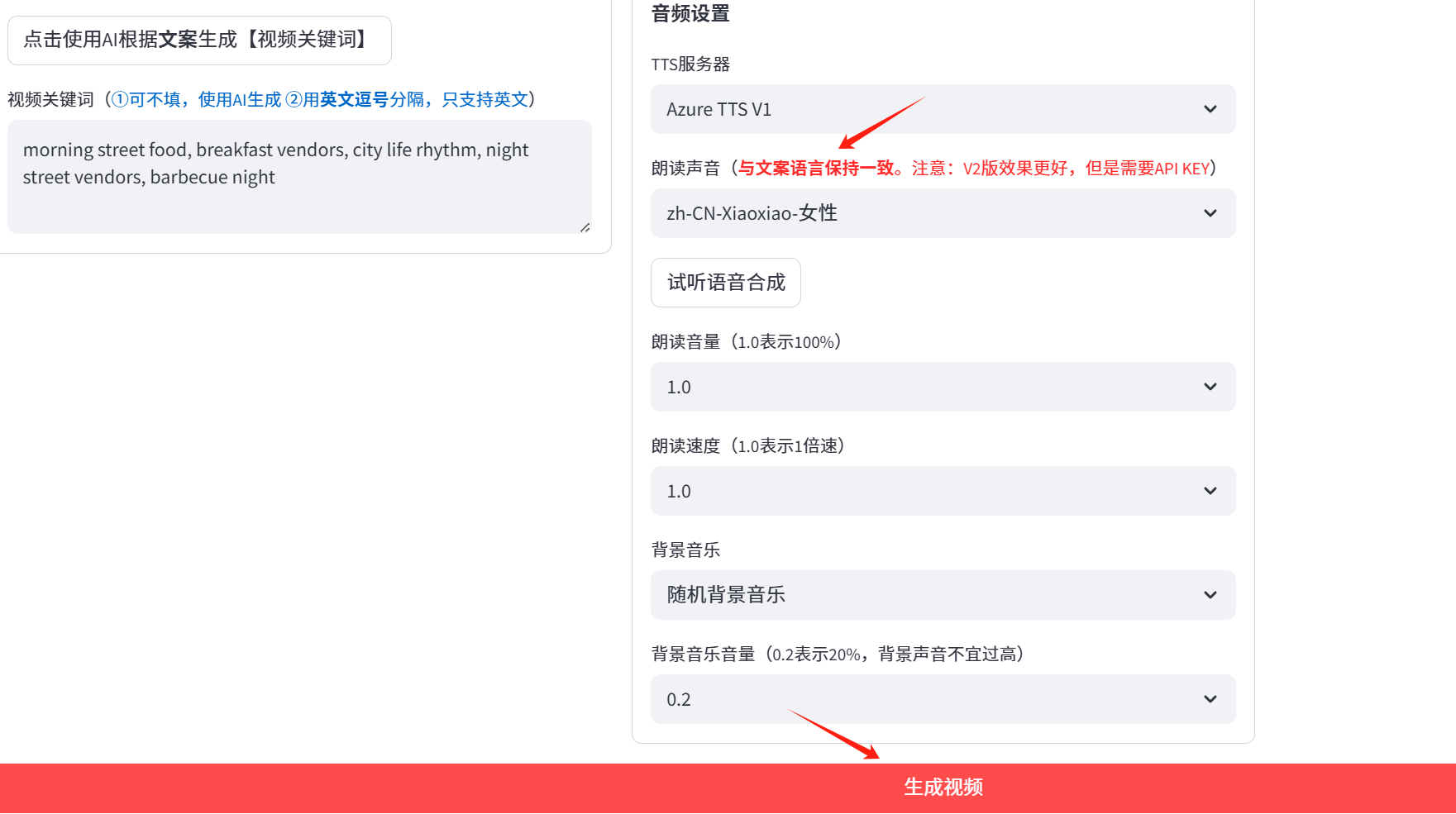 文案设置视频主题:人间烟火,你可以输入别的主题。 视频文案:这里直接AI生成,你可以手动输入。最好还是AI生成,自然一点。 视频关键词:这里直接AI生成,只支持英文 视频来源:选择Pixbay,最好选这个,国内网络可以使用。 启用字幕:默认启用,默认字体即可。