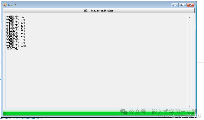 worker.ReportProgress(i, $"处理进度: {i}%"); } } private void BackgroundWorker_ProgressChanged(object sender, ProgressChangedEventArgs e) { progressBar.Value = e.ProgressPercentage; textBoxLog.AppendText($"{e.UserState}\r\n"); } private void BackgroundWorker_RunWorkerCompleted(object sender, RunWorkerCompletedEventArgs e) { btnStart.Enabled = true;