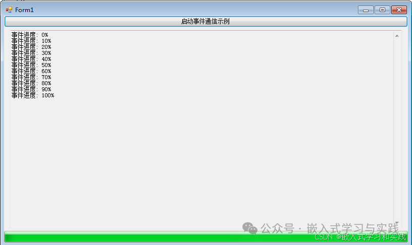 public partial class Form1 : Form { public event EventHandler<ProgressEventArgs> ProgressUpdated; public Form1() { InitializeComponent(); this.ProgressUpdated += OnProgressUpdated; } private void btnStart_Click(object sender, EventArgs e) { Thread workerThread = new Thread(new ThreadStart(WorkerWithEvents)); workerThread.IsBackground = true; workerThread.Start(); } private void WorkerWithEvents() { for (int i = 0; i <= 100; i += 10) { Thread.Sleep(400); OnProgressUpdated(this, new ProgressEventArgs(i, $"事件进度: {i}%")); } } protected virtual void OnProgressUpdated(object sender, ProgressEventArgs e) { if (this.InvokeRequired) { this.BeginInvoke(new Action<object, ProgressEventArgs>(OnProgressUpdated), sender, e); return; } progressBar.Value = e.Percentage; textBoxLog.AppendText($"{e.Message}\r\n"); } } public class ProgressEventArgs : EventArgs { public int Percentage { get; set; } public string Message { get; set; } public ProgressEventArgs(int percentage, string message) { Percentage = percentage; Message = message; } }}