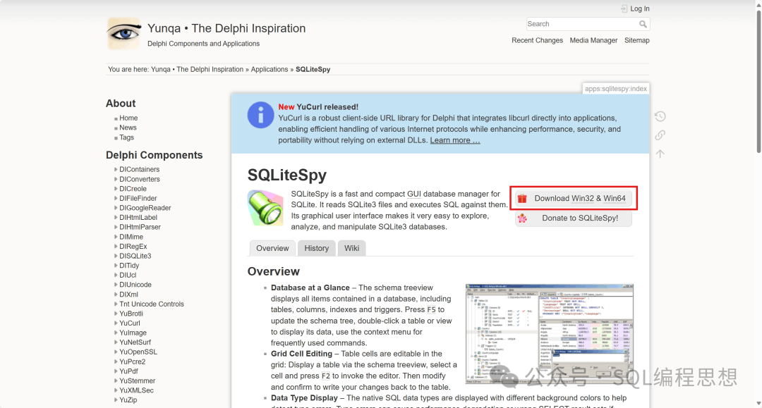 下载安装SQLiteSpy 官方下载网址如下: https://www.yunqa.de/delphi/apps/sqlitespy/index