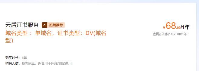 前段时间有人再问,用免费的SSL证书或者这个68元1年的证书,搭建微信小程序后端使用,可以吗? 这个理论上是完全没有问题的,个人可以用,企业也是可以用的,不过一般有预算或者有实力的企业还是推荐购买好一点的SSL证书,这个定位的是个人测试使用的。 阿里云其实有68元1年的SSL证书,这个性价比还是非常高的,个人觉得还是非常值得购买,不管是个人开发者还是企业用户都可以考虑。 阿里云68元1年SSL: 便宜的或者是免费的SSL理论上也会可以商用的,用在企业项目上没问题的。 购买步骤: 1、打开阿里云页面,点击购买 URL:https://t.aliyun.com/U/opaikv ![]() 2、这个是属于单域名DV证书,1年期的,比三个月的好,避免了频繁更换SSL。也可以直接在SSL控制台选择,68元1年的在SSL控制台选择个人测试证书购买,选择个人测试证书(pro)。 ![]() 部署 SSL 证书(即启用 HTTPS)早已不是“可选项”,而是现代网站的基础标配。无论你的网站是企业官网、个人博客、电商店铺还是小程序后端,SSL 都至关重要。以下是部署 SSL 证书的核心好处,从安全、体验到 SEO 全面覆盖: 1. 数据加密传输,防止中间人窃听与篡改