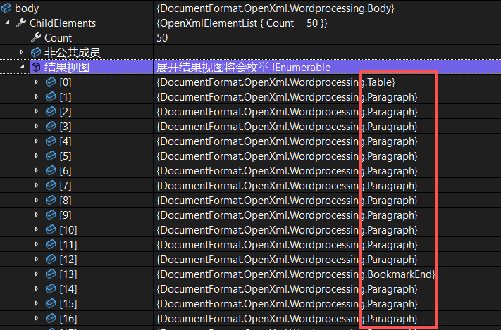 其他OpenXmlElement对象我们可以通过检视对象的的ChildElements,找到包含感兴趣文本的类型,然后获取。