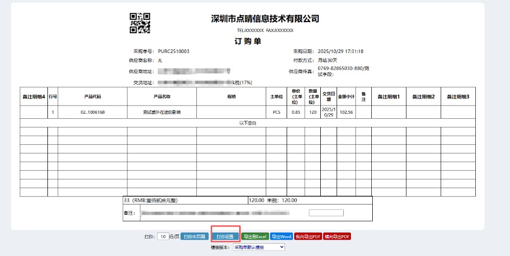 采购单上只能添加已有的字段目前加不了这个,只能自己制作。具体可以在采购单上的打印设置里查看。