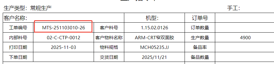答:正常打印出来的生产工单号后面如果多了类似“-26”的情况那个是“子单号”,主要是用于后续批量发料操作的。