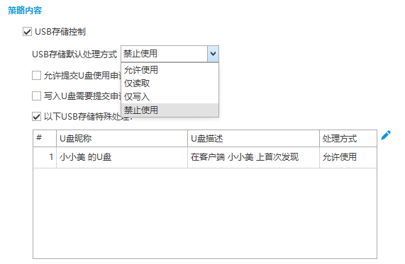 管控使用U盘的权限,全部禁止或者是只允许使用公司安全U盘,禁止一切陌生或私人U盘使用,防止乱用U盘导致病毒感染。除了U盘以外,还可以做到管控所有外接设备接入。