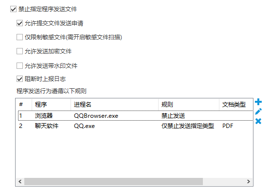 设置下班后的时间,禁止程序发送文件,如果有恶意程序控制计算机在下班时间发送文件,客户端软件会直接拦截,禁止外发,防止银狐控制计算机私自传播文件。