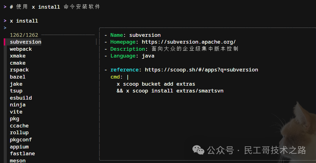 执行 x install 命令后,会启动一个基于 fzf 的交互式界面。用户可以通过该界面搜索各种软件工具,并预览它们的安装方法。