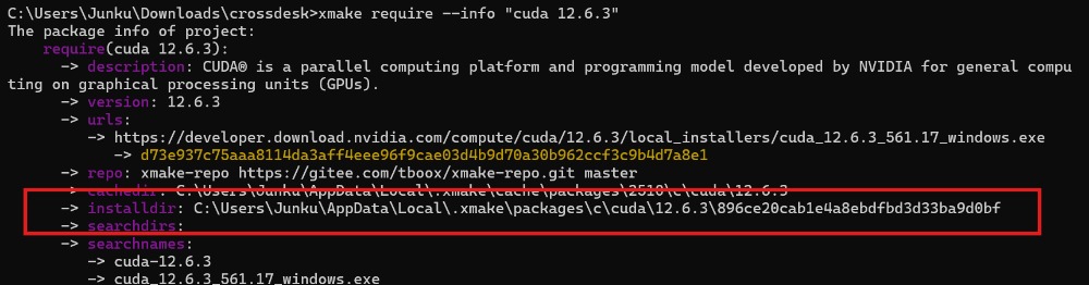根据上述输出获取到 CUDA 的安装目录,即 installdir 指向的位置。将 CUDA_PATH 加入系统环境变量,或在终端中输入:
