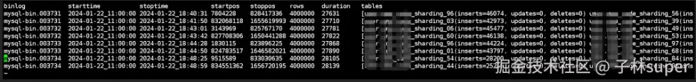 从输出文件 biglong_trx.txt 中,我们发现 8 个典型的大事务从 2024-01-22 11:00 持续到 2024-01-22 18:48,最长的大事务执行了约 7 小时 48 分钟,每个大事务涉及 400 万行数据,分别写入 100 个分表。事务详情显示了对多个 db.t_sharding_XX 表的插入操作,如下图: