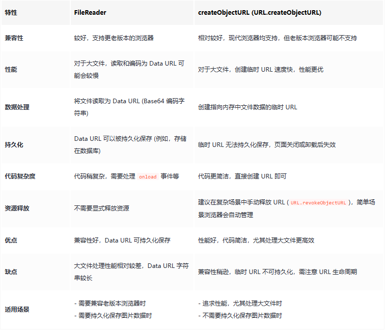• 如果更注重性能,尤其是处理大文件,并且不需要持久化保存图片数据,可以选择 createObjectURL。 对于大多数现代网页应用来说,createObjectURL 通常是一个更优的选择,因为它更简洁高效。