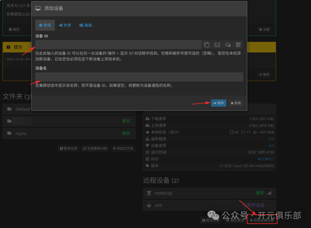 • • 打开 Syncthing Web 界面(http://127.0.0.1:8384),查看“Default Folder”和“rsync”文件夹是否仍在报错。