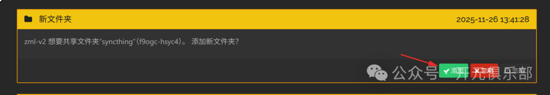 • • 保存后,B 的界面会弹出一个提示“A 想要共享文件夹”,点击“添加”,设置好 B 本地的路径即可。