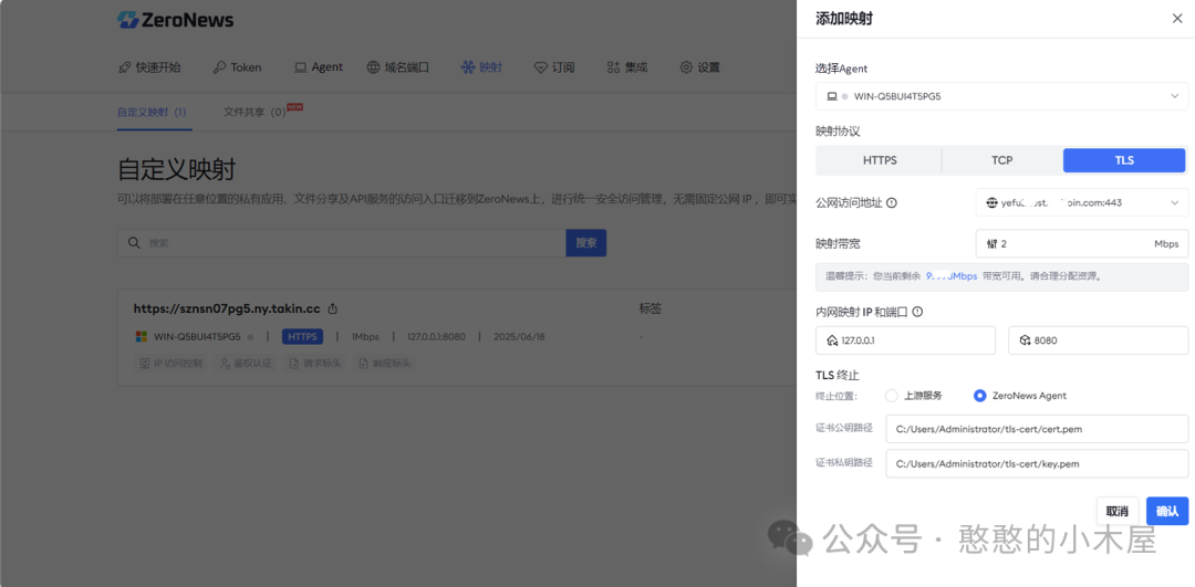当然了,ZeroNews也支持绑定自有域名并配置TLS证书,使用自己的域名那肯定是更方便,官方提供的二级域名肯定是不如自己的域名容易记住。添加自己的域名后,就可以使用tls终止功能,这样所有节点始终透传tls加密流量,对用户tls访问流量不可见,确保用户数据无法窃取与篡改。