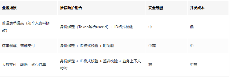 落地建议:先实现“身份绑定(Token解析userId)+ ID格式校验”(零成本、高收益),核心场景再叠加签名校验,无需过度设计;