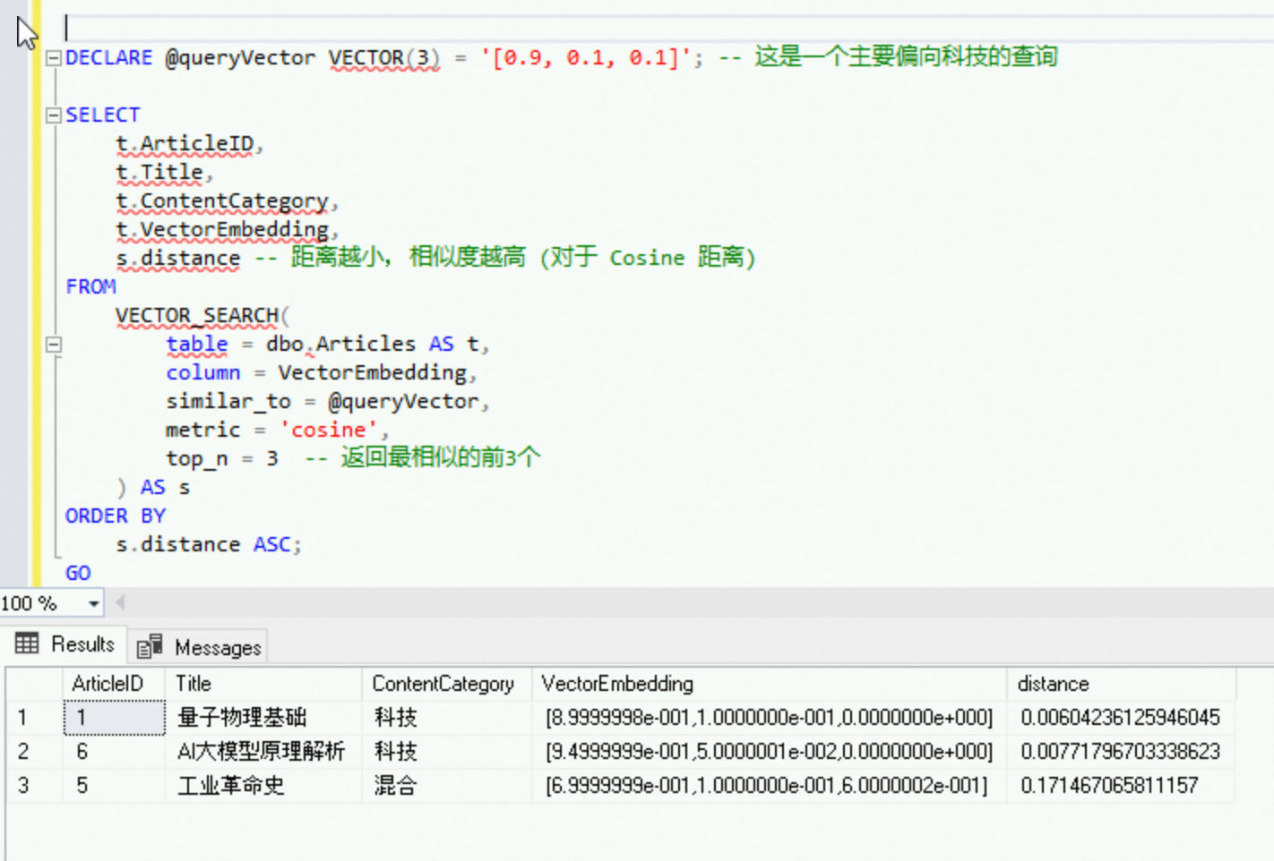 向量类型SQL Server 2025新增Vector数据类型VECTOR(n) ,VECTOR(n) 本质上是一个固定长度的浮点数数组,里面整整有 n 个元素。比如 VECTOR(3) 就是 3 维向量。示例数据:[0.1, 2, 30],该数据类型在磁盘上以紧凑的二进制存储。避免了文本解析的 CPU 开销,同时能够大幅减少存储空间占用。 现在我们可以使用下面SQL简单创建一个Vector类型的表并插入测试数据。