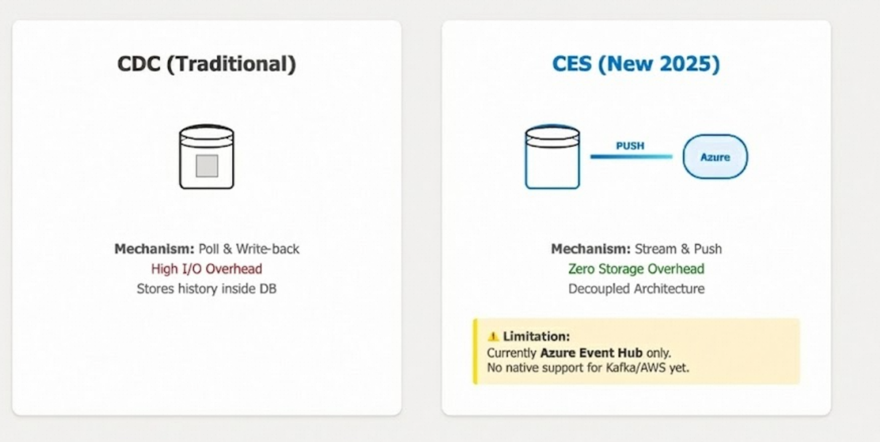 说到CES不得不提一下CDC,CDC属于一个业界标准的变更捕获工具,由SQL Server 2008开始引入,对于该功能,我有点一言难尽,该功能的本质并不是集成在内核中,而是依赖一系列系统存储过程,系统表以及SQL Server Agent作业 的 LogReader 作业读取事务日志完成,复杂度和IO负载开销非常高,我做过这么多年SQL Server依然不敢保证能解决所有的CDC相关问题。 而CES工作原理是不再把变更数据写回本地数据库,而是直接从内存或日志中截获变更,打包成标准事件,推送到外部。带来的好处是不需要在数据库内维护巨大的系统变更表,大幅减少 I/O。下游消费者(如实时数仓、微服务)直接订阅消息队列,完全不需要触碰生产数据库。同时获取近乎实时的数据流传输。 虽然 CES 在协议层面上宣称支持 AMQP 和 Kafka 协议,但在 SQL Server 2025 的当前预览版和微软的官方支持路径中,它主要且唯一支持的目标端点是 Azure Event Hubs (Azure 事件中心)。 在国内公有云场景下,当前更成熟、可落地的路径依然是“SQL Server CDC + 阿里云 DTS/消息队列”的组合:由数据库负责变更捕获,由 DTS 或自建消费程序转发到 Kafka、数据湖或实时数仓。未来如果 CES 对第三方云平台开放Endpoint,我们也会评估如何在 RDS 中提供托管级的一键配置能力。