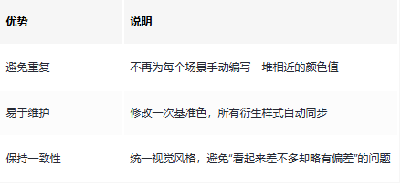 相对颜色,顾名思义,是在已有颜色的基础上,调整其某些成分(如亮度、透明度、色相等)来生成新颜色。核心理念是:定义一次,派生多种样式