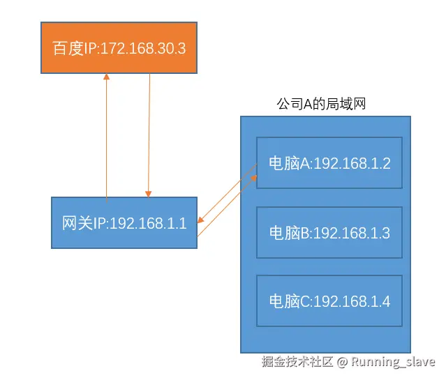 我们也知道,由于百度和电脑A不在一个局域网内,所以A要访问百度,那么必须得经过网关。而网关的这个IP地址,是真实存在的,是可以访问百度的。