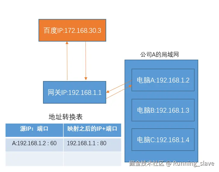 百度把结果返回给网关的80端口之后,网关再通过映射表,就可以把结果返回给 A的60端口 了。