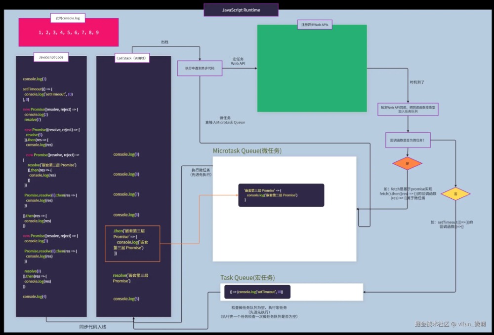 这可能只是简单的JavaScript代码执行事件循环流程,目的也是让大家更直观理解其中原理。实际执行过程可能还会读取堆内存获取引用类型数据、操作dom的方法,可能还会触发页面的重排、重绘等过程、异步文件读取和写入操作、fetch发起网络请求,与服务器建立连接获取网络数据等情况。
