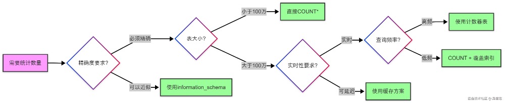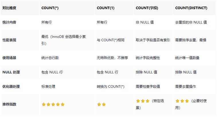• 统计总行数:使用 COUNT(*),语义清晰,性能最优