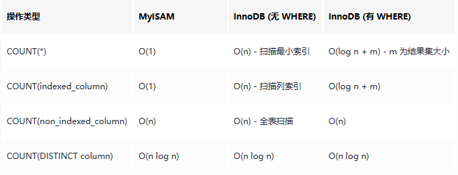 • 注意存储引擎差异:MyISAM 的 COUNT(*)是 O(1),InnoDB 是 O(n)
