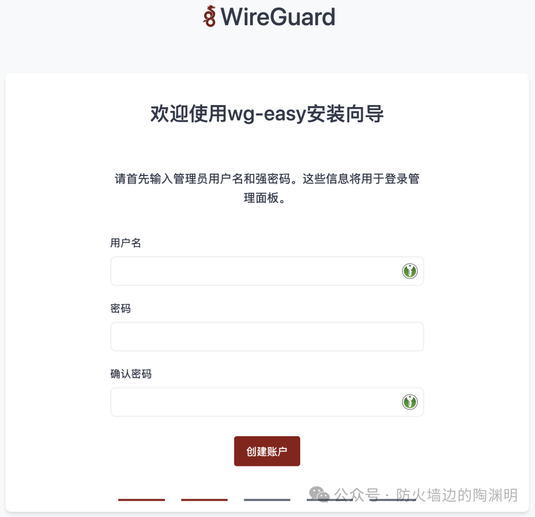 部署 WireGuard 有多简单?我们用 github 上的著名开源项目 wg-easy 来进行演示,它的部署方式以 Docker 为例,任何支持 Docker 的平台都只需几步即可完成安装与配置。项目地址: https://github.com/wg-easy/wg-easy 容器正常运行之后,就可以在 Web 页面进行初始化了。 访问地址:http://your.ip:51821