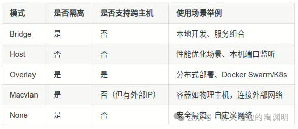 Docker 网络主要有 五种模式(驱动),每种模式都对应着特定的使用场景。满足从本地开发、沙箱环境、集群部署到物理网络集成的各种需求。