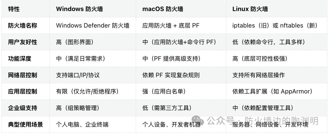 安装在计算机或服务器上,监控单个设备的流量(如 Linux iptables)。 检查每一个经过的数据包,根据设定规则决定是否放行,工作在网络层(L3)。 防火墙作为中介,将内部请求代理到外部资源,提高安全性,工作在应用层(L7)。 跟踪每一个连接的状态,确保只有合法的返回流量被允许通过,工作在传输层(TCP/UDP)。 综合传统防火墙功能,加上应用识别、深度包检测、行为分析、IDS(入侵检测)、IPS(入侵防御)等高级功能。