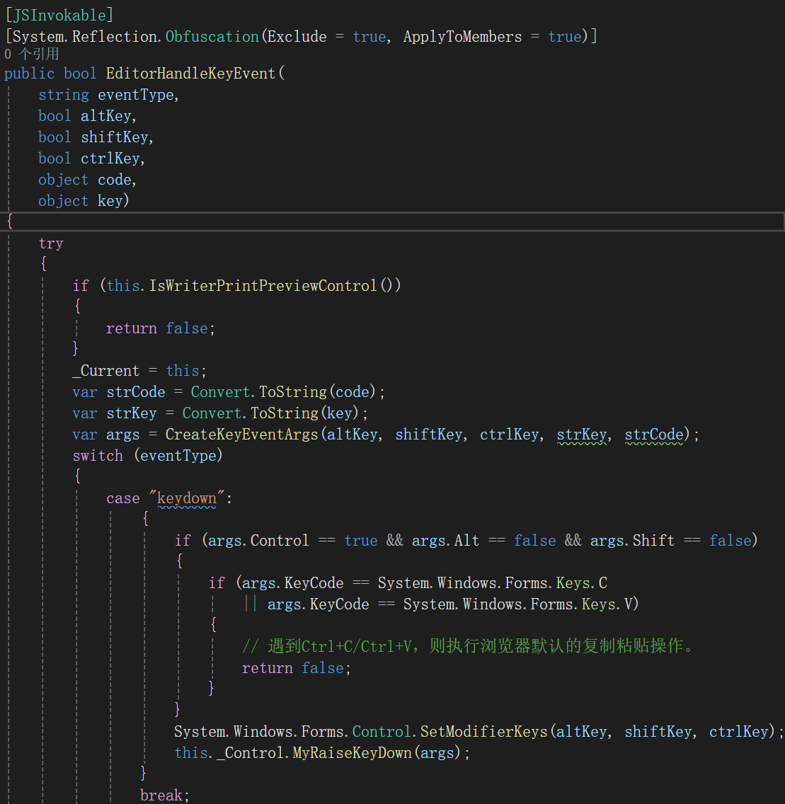 在这个键盘事件处理的JS代码中,我们使用invokeMethod()通过JSInterop调用了在C#端定义的EditorHandleKeyEvent()函数,并将事件参数传递给C#端。