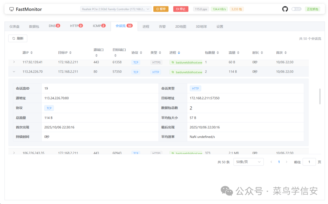 • 🚀 高性能抓包引擎: 基于 gopacket/pcap 实现,支持数据包实时处理,并对五元组会话/DNS/ICMP/HTTP进行分类展示