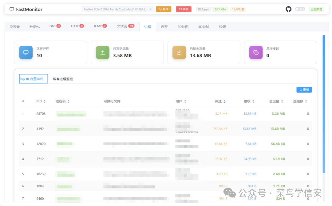 • 🎯 精准进程关联: 自动将网络流量与进程绑定,支持主流操作系统