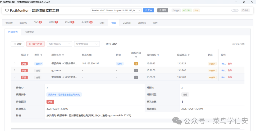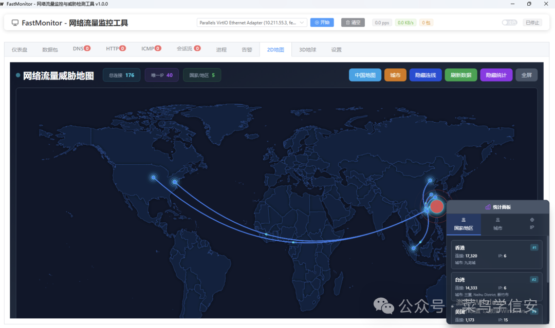 FastMonitor 是一款基于 Wails 框架开发开源的跨平台网络流量监控与威胁检测工具,集成了数据包分析、进程关联、会话流统计、威胁情报检测、地理位置可视化等功能于一体。
