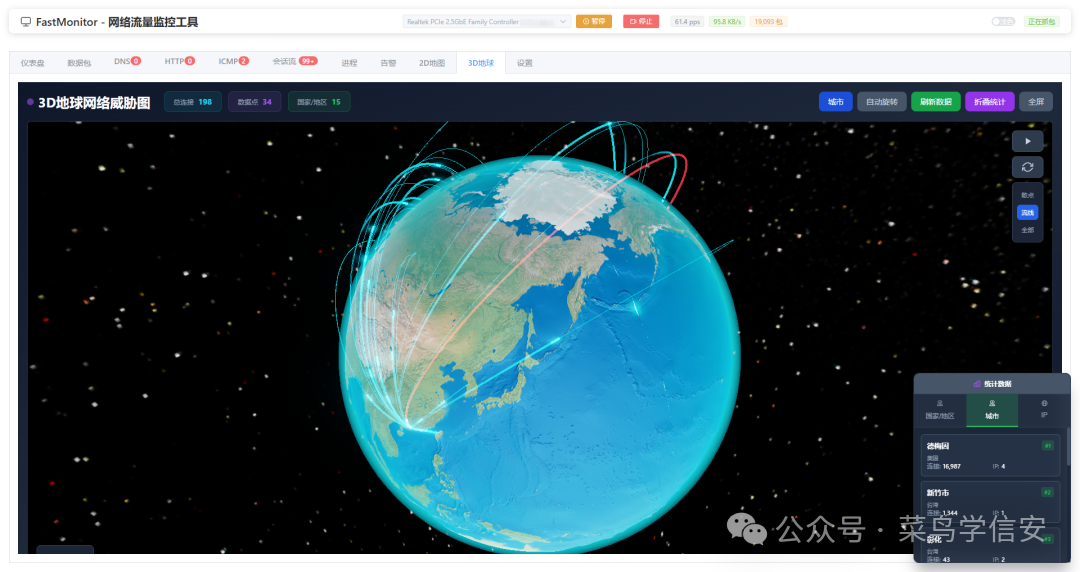 • 上图:将当前计算机的所有网络访问进行可视化,将数据渲染后3D 地球 实现本网络访问可视化分析