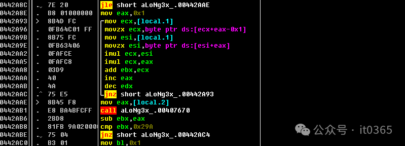 00442A93  |> /8B4D FC       /mov ecx,[local.1]00442A96  |. |0FB64C01 FF   |movzx ecx,byte ptr ds:[ecx+eax-0x1]00442A9B  |. |8B75 FC       |mov esi,[local.1]00442A9E  |. |0FB63406      |movzx esi,byte ptr ds:[esi+eax]00442AA2  |. |0FAFCE        |imul ecx,esi00442AA5  |. |0FAFC8        |imul ecx,eax00442AA8  |. |03D9          |add ebx,ecx00442AAA  |. |40            |inc eax00442AAB  |. |4A            |dec edx00442AAC  |.^\75 E5         \jnz short aLoNg3x_.00442A9300442AAE  |>  8B45 F8       mov eax,[local.2]00442AB1  |.  E8 BA4BFCFF   call aLoNg3x_.0040767000442AB6  |.  2BD8          sub ebx,eax00442AB8  |.  81FB 9A020000 cmp ebx,0x29A00442ABE  |.  75 04         jnz short aLoNg3x_.00442AC400442AC0  |.  B3 01         mov bl,0x1