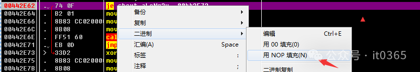 在JE处右键--二进制--NOP填充不让它跳