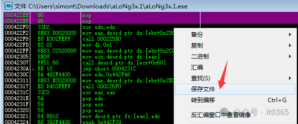 中文软件,具体功能按钮自己点击了解即可。我们直接选择 过程,这里就有很多的事件了。从名字可以看出 如okclick和cancellaclick就可能是软件上的下面的2个按钮了。这里要关注的就是RVA代码,将要分析的软件 aLoNg3x.1.exe拖进OllyDBG 按下ctrl+g把DarkDe4逆向出来的所有RVA地址下断点。此时发现在输入框输入一个字就会断下来。这是我输入注册码断下的位置: