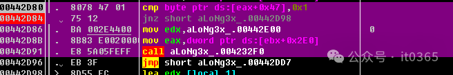 00442D80  |.  8078 47 01    cmp byte ptr ds:[eax+0x47],0x100442D84  |.  75 12         jnz short aLoNg3x_.00442D9800442D86  |.  BA 002E4400   mov edx,aLoNg3x_.00442E00                ;  000442D8B  |.  8B83 E0020000 mov eax,dword ptr ds:[ebx+0x2E0]00442D91  |.  E8 5A05FEFF   call aLoNg3x_.004232F000442D96  |.  EB 3F         jmp short aLoNg3x_.00442DD7