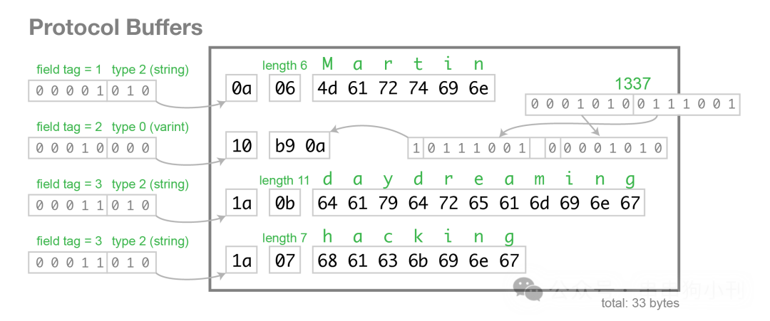 而且 Protobuf 是二进制的。不仅仅是二进制,它无文本键(它们被数字标签取代),它无空格,无 JSON 开销,甚至内部还有一些数据结构上的优化。