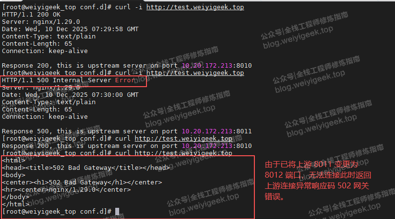 # 第一次访问正常返回上游服务端口信息,第二次访问模拟异常返回500错误码。 $ curl -i http://test.weiyigeek.top $ curl -i http://test.weiyigeek.top HTTP/1.1 500 Internal Server Error Server: nginx/1.29.0 Date: Wed, 10 Dec 2025 07:30:00 GMT Content-Type: text/plain Content-Length: 65 Connection: keep-alive Response 500, this is upstream server on port 10.20.172.213:8011 # 在213主机中将8011端口修改为8012后执行,用以模拟上游服务异常。 $ curl http://test.weiyigeek.top $ curl http://test.weiyigeek.top <html> <head><title>502 Bad Gateway</title></head> <body> <center><h1>502 Bad Gateway</h1></center> <hr><center>nginx/1.29.0</center> </body> </html> weiyigeek.top-验证1上游服务连接失败时图