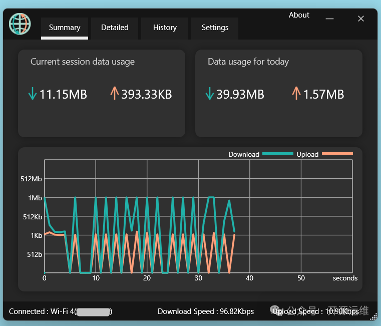 主界面最显眼的就是实时上传和下载速度,数字跳动得清清楚楚。它不像那些专业工具给你画一堆复杂的折线图,就是最简单的数字,配合历史曲线,一眼就能看出网络是不是在抽风,对我这种怕麻烦的人来说刚刚好