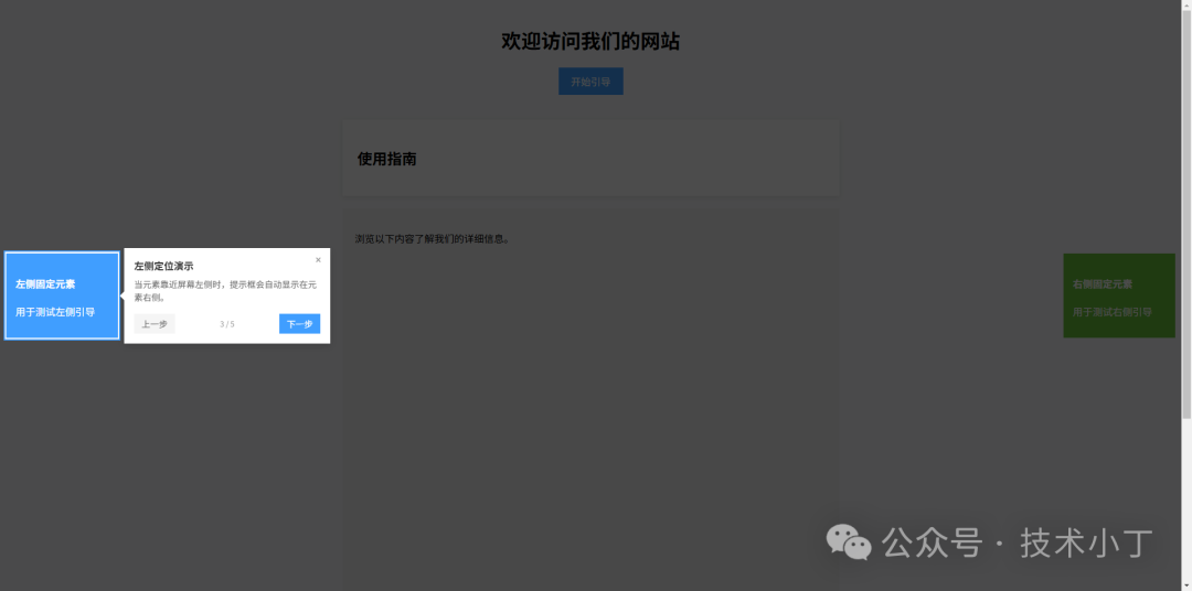 页面主要包含以下区域:引导按钮、内容卡片、超出页面的元素区域和边缘元素区域。引导组件启动时会由 JavaScript 生成覆盖层、高亮区域和提示框。<button id="startGuide" class="btn">开始引导</button>